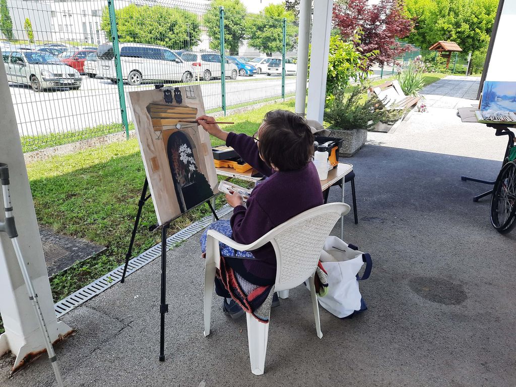 Udeleženci delavnice so pod strokovnim mentorstvom slikarke ga. Ljudmile Turk svoje znanje izpopolnjevali v različnih tehnikah slikanja: akrilu in olju na platno, risanju s svinčnikom, ogljem, itd.
