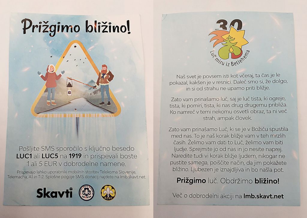 Župan Gregor Macedoni je danes od Združenja slovenskih katoliških skavtinj in skavtov prejel Luč miru iz Betlehema, ki je letos že tridesetič pripotovala v Slovenijo. Luč, s katero se po svetu raznaša sporočilo o univerzalnem pomenu miru, se letos ponaša z geslom Prižgimo bližino, spremlja pa jo dobrodelna akcija zbiranja sredstev za organizacije Lunina vila, Lebanese Girl Scout Association in Sklad sv. Lucije.