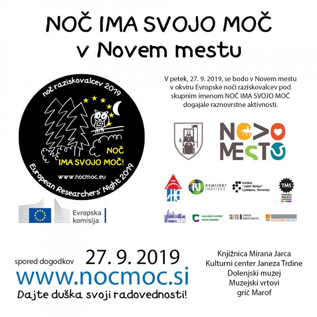 Po vsej Evropi se na pobudo Evropske komisije za en dan v letu široko odprejo vrata organizacij, ki se ukvarjajo z znanostjo in raziskovanjem, da bi predstavile poklic in življenje znanstvenika širši javnosti. Konzorcij partnerjev Ustanova Hiša eksperimentov, Institut "Jožef Stefan", Kemijski inštitut in Tehniški muzej Slovenije je skupaj sooblikoval projekt "Noč ima svojo moč". Evropska noč raziskovalcev je vseevropska akcija v okviru programa za raziskovanje in tehnološki razvoj - Obzorje 2020 (Horizon 2020). V "nočnih" dejavnostih bo po vsej Sloveniji sodelovalo več kot 40.000 obiskovalcev iz različnih ciljnih skupin. V Novem mestu bodo na dogodku sodelovali različni izvajalci na več kot 50 individualnih dogodkih. Skozi ves dan in ponekod tudi v večernih urah se boste otroci, učenci, dijaki, študentje, pa tudi odrasli lahko udeležili eksperimentalnih delavnic, ogledov laboratorijev, navdihujočih klepetov z znanstveniki, zanimivih predavanj, poučnih razstav ter številnih drugih aktivnosti.