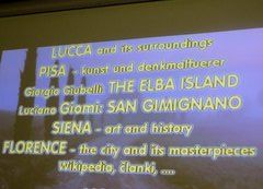 Toskana, dežela sončnic in trt, je lepa tudi pozimi. Kar 6 biserov iz Unescove svetovne dediščine jo krasi. Med njimi privablja poševni stolp v Pisi, v Sienni je ena največjih gotskih stolnic v Evropi, Volterra je prestolnica alabastra, San Gimignanu pravijo srednjeveški Manhattan, Lucca preseneča s svojim mogočnim obzidjem, Firence pa imajo v številnih galerijah, cerkvah, spomenikih, zgodovinskih stavbah in muzejih umetnin za več desetletij občudovalce. Nikoli dovolj pregledanih lepot! Mnoge smo spoznali tudi sami pred leti in bilo je to lepo spominjanje. Gladina morja, lepota kamnite obale in modrina neba sta nas prevzeli. Toliko lepot in podatkov je napolnilo naše glave, da bomo še dolgo uživali v lepotah njune, zdaj pa tudi naše poti v svet, tudi v preteklost.