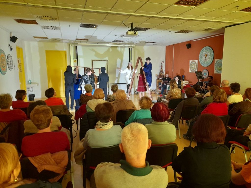 Četrtkovo srečanje 16. marca Univerze za starejše RIC Novo mesto je bilo posebno. Obiskala nas je gledališka skupina Gledališče te poišče OŠ Drska. Lanska nagrada za nastop jih je spodbudila, da so se pripravili še za naslednje tekmovanje. Mi smo bili poskusna in hvaležna publika. Kar 23 igralcev sodeluje in sledi spodbudam mentoric in mentorjev. Na zanimiv način so s scenografijo priklicali prave prizore dvorjenja, domače prigode, tekmovanje za punco v plesu in seveda dvorjenje fanta punci po njihovo. Opremljeni s telefoni so dokazali, da tistega pravega dvorjenja sploh več ni in vse telefon nadomesti. Z glasbo so zapolnili odmore med prizori, ki so se menjavali hitro in zanimivo. Pod budnim očesom mentoric Karmen Sepaher in Klavdije Bizjak so kar dobro sledili naučenemu tekstu. Sodeloval je tudi glasbeni učitelj Tomas Vatroslav, ki je igral z muzikanti, vse pa je spremljal in pomagal Marko Glavan.