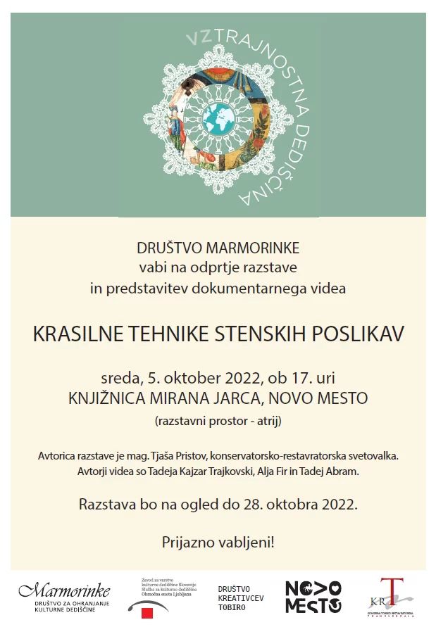 Društvo Marmorinke iz Novega mesta se ukvarja z ohranjanjem in promocijo kulturne dediščine. Člani društva, konservatorji-restavratorji, si prizadevajo za boljšo prepoznavnost svojega področja dela. Vsako leto pripravljajo dogodke, ki so vključeni v projekt Dnevi evropske kulturne dediščine, ki letos potekajo pod geslom Vztrajnostna dediščina, tokrat pa vabijo na odprtje razstave v sredo, 5. oktobra 2022, ob 17. uri v Knjižnico Mirana Jarca. Avtorica razstave se bo predstavila s krasilnimi tehnikami stenskih poslikav.