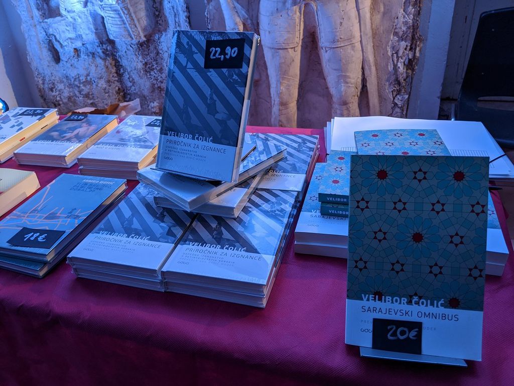 Velibor Čolić rad prihaja v Slovenijo in v Novo mesto, kjer je našel Založbo Goga oziroma je založba našla njega in do sedaj izdala dva odmevna romana; Sarajevski omnibus in Priročnik za izgnance v izvrstnem prevodu Ane Barič Moder.