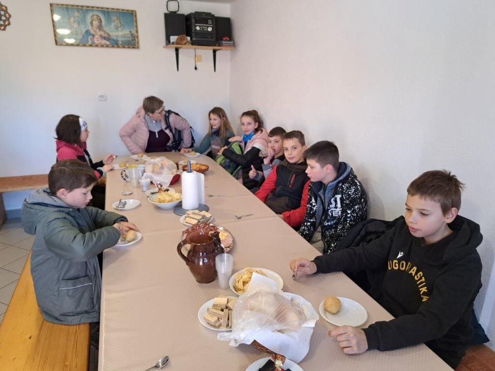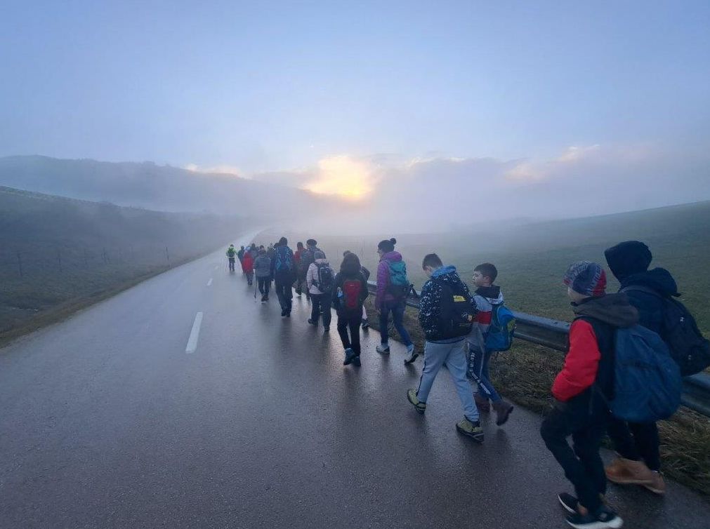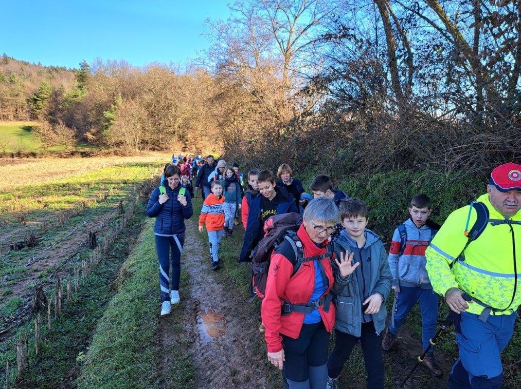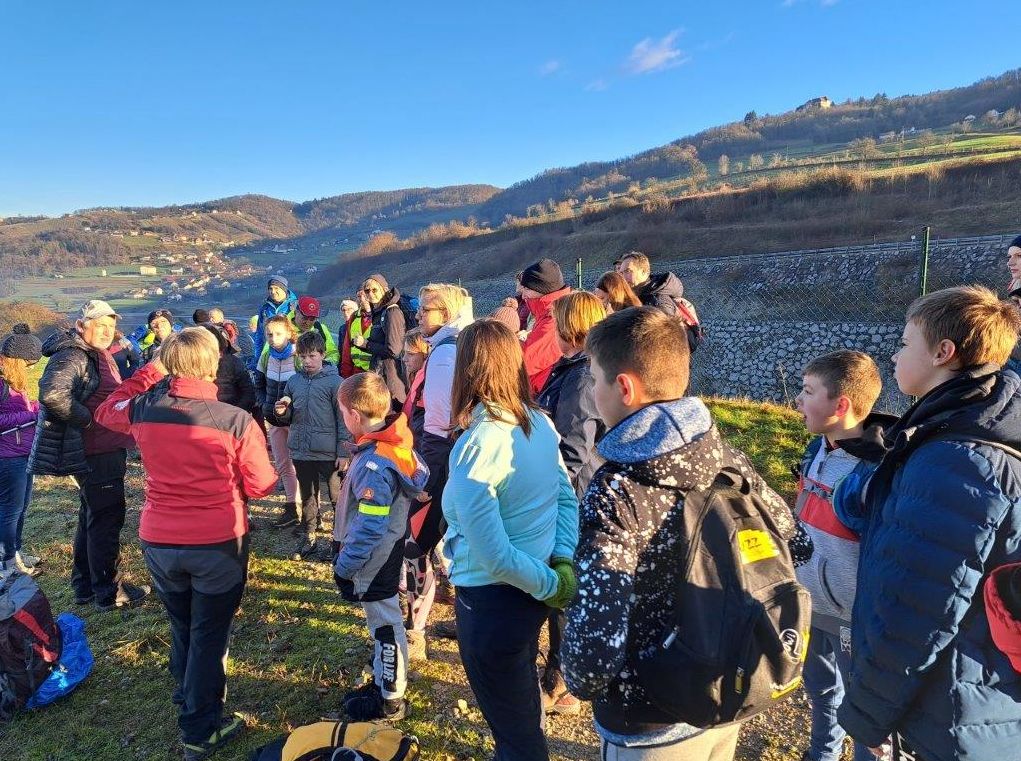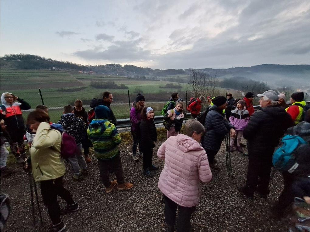 Lahko bi rekli, da je januarska tura že tradicionalna, glede na to, da se že 10 let na izhodišče peljemo z vlakom. V soboto, 14. januarja 2023, se nas je zbralo na železniški postaji Bršljin, ob 6.30, kar 48 planincev. Z vlakom smo se odpeljali do Mirne Peči. Na postaji smo se pripravili za varno hojo, si nadeli lučke, odsevnike, kajti na pot smo krenili še v temi. V dolgi koloni smo šli ob robu ceste in nato po pločniku do makadamski ceste, ki poteka vzporedno ob avtocesti. Po prvem vzponu, ki nas je segrel, smo naredili počitek. Počasi se je začelo daniti. Na razglednem postanku smo pogledali vasico Šentjurij in mladi planinci so povedali, da je to rojstna vas Toneta Pavčka, pesnika. Na nasprotnem bregu so se razprostirale vasice, nad njimi vinske gorice, po dolini pa se je vila avtocesta, ki je s avtomobilskim hrupom kalila jutranjo svežino. Med potjo nas je za kratek čas ovila megla. Na vrhu Karteljevskega klanca pa nas je obsijalo sonce. Postanek z okrepčilom, informacijami o Rudolfovi poti in razgledom na Hmeljnik, Karteljevo, Golobinjek,, je bil zelo prijeten. Zavili smo na Rudolfovo pot, ki nas je skozi gozd popeljala v bližino vasi Daljni Vrh. Pred nami se je odprl razgled na novomeško kotlino. Všeč nam je bil ta razgled in prepoznavanje znane pokrajine okrog našega Novega mesta. Sledil je kratek del poti nad vasjo Gornje Kamence in že smo zavili na dvorišče Brezarjevih. Gostoljubna Franci in Nevenka sta nas povabila k pripravljeni malici. Na pomoč sta jima prišli še sosedi Majda in Mateja. Postregli so nas z narezkom, češpljevimi in mareličnimi cmoki, piškoti, čajem, kuhančkom in kavico. Ob dobrotah smo se prijetno družili in obujali spomine na skupne ture in seveda delali plane, kam bomo letos še šli. V pogovoru smo se spomnili Lojzeta Slaka in Henčka, ki sta bila iz teh krajev. Med nami pa ni bilo junaka, ki bi kakšno njuno zapel. Zahvalili smo se gostiteljem, ki so nas tako okusno razvajali, se vsi skupaj fotografirali in krenili po blatnem kolovozu med njivami, travniki, skozi gozd v Dolnje Kamence. Šli smo skozi vas in zavili na kolovoz pod vasjo, ki nas je pripeljala v Novo mesto. Pred nami pa je bil le še košček poti do železniške postaje Bršljin, kjer smo v temi začeli in v soncu zadovoljni zaključili prijetno turo.