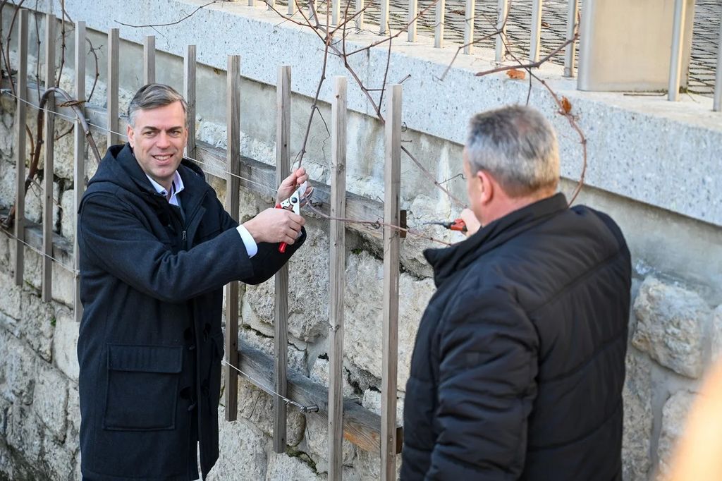 Župan Gregor Macedoni in skrbnik mestne trte Peter Korene iz Društva vinogradnikov Trška gora sta v družbi predsednika Zveze društev vinogradnikov Dolenjske Mirana Juraka danes, 14. februarja 2024, tradicionalno obrezala potomko najstarejše žlahtne vinske trte na svetu, ki raste na Pugljevi ulici. Zavod Novo mesto je ob tem napovedal tudi letošnji Festival cvička, ki bo med 24. in 26. majem v skupni organizaciji z Društvom novomeških študentov in Zvezo društev vinogradnikov Dolenjske potekal na Glavnem trgu.