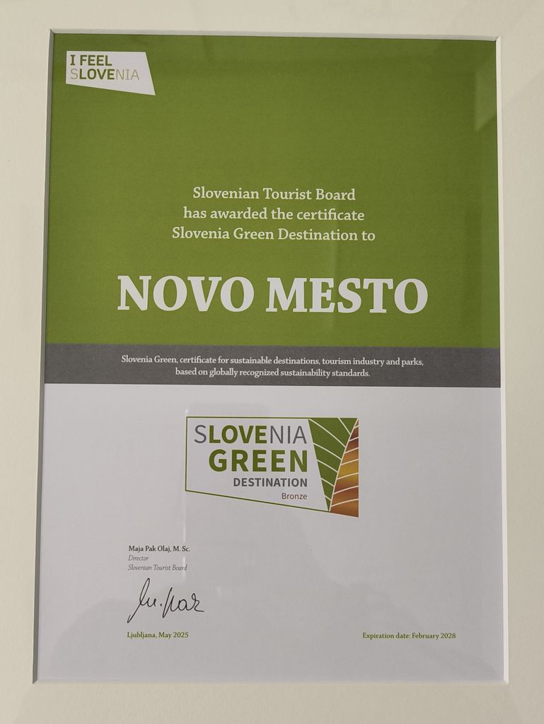 Slovenska turistična organizacija (STO) je v Ljubljani pripravila Zeleni dan slovenskega turizma, osrednji dogodek trajnostnega turizma v Sloveniji, na katerem je podelila plakete Slovenia Green. Kot destinacija Novo mesto smo uspešno obnovili svojo zavezanost trajnostnemu razvoju turizma in prejeli bronasti znak Slovenia Green. V imenu destinacije je plaketo prevzela zelena koordinatorka Vesna Troha iz Zavoda Novo mesto, ki v destinaciji skrbi za izvedbo vseh aktivnosti v povezavi z Zeleno shemo.