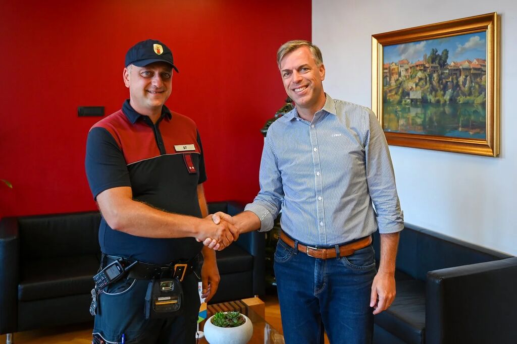 Župan Gregor Macedoni je danes na rotovžu sprejel redarja Jožeta Medveda in mu osebno čestital za njegovo požrtvovalno in plemenito ravnanje.