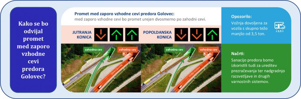 Ministrstvo za infrastrukturo RS je skupaj s Fakulteto za gradbeništvo, prometno inženirstvo in arhitekturo Univerze v Mariboru in Družbo za avtoceste RS pripravilo omilitvene ukrepe za uporabnike predora Golovec. V obdobju gradbenih del namreč pričakujejo močno povečan promet na celotni ljubljanski obvoznici ob delovnikih med 7. in 9. uro zjutraj ter med 15. in 17. uro popoldne.