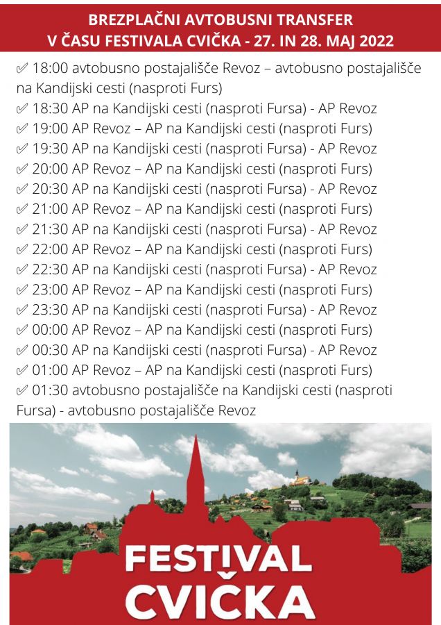 Brezplačni avtobusni transfer bo deloval v času Festivala cvička v petek in soboto, 27. in 28. maja 2022, med 18.00 in 1.30, povezoval pa bo parkirni prostor pred podjetjem Revoz (Belokranjska cesta 4) in avtobusno postajališče Kandija (ob vhodu na makadamsko parkirišče Kandija) nasproti FURS-a. Vozil bo vsakih 30 minut.