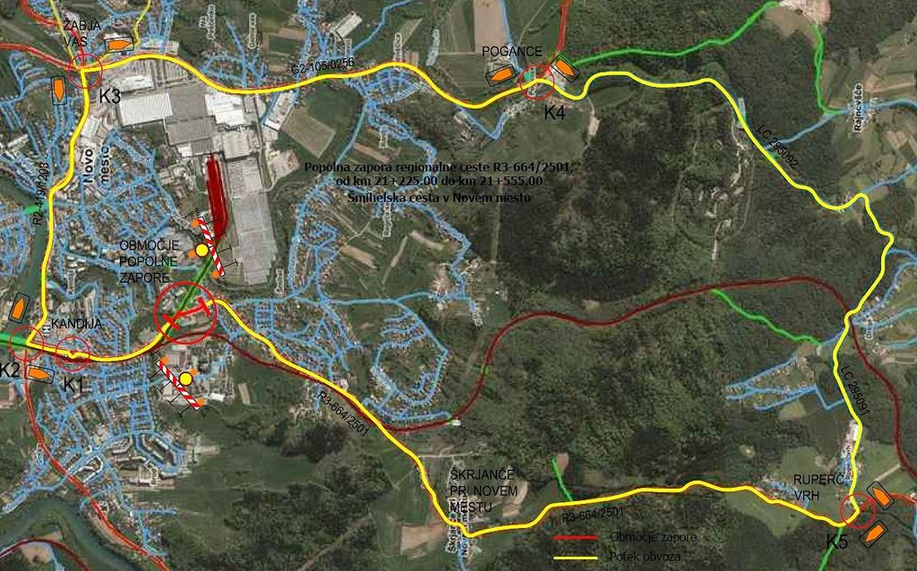 Štiridnevna popolna zapora bo prvi dan postavljena po jutranji prometni konici in bo locirana med šmihelskim pokopališčem in križiščem s Smrečnikovo ulico, obvoz pa bo urejen na relaciji Šmihel–Ruperč vrh–Poganci–Žabja vas–Kandija ter obratno. Stanovalcem ob trasi zapore bo dostop z vozili omogočen v dogovoru z vodjo gradbišča, pešci pa bodo lahko prehajali skozi območje zapore po označenem koridorju. Po zaključenem asfaltiranju bo promet po prenovljeni državni cesti v Šmihelu ponovno potekal nemoteno, do konca aprila pa se bodo izven cestišča nadaljevala še zaključna manjša dela in ureditev signalizacije.