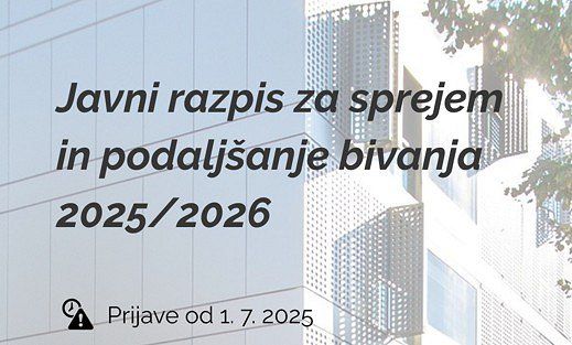 Ministrstvo za visoko šolstvo, znanost in inovacije je objavilo Razpis za sprejem in podaljšanje bivanja študentov višješolskega in visokošolskega študija v študentskih domovih in pri zasebnikih za študijsko leto 2025/2026. Prijava je mogoča od jutri, 1. 7. 2025, dalje.