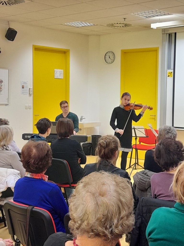 V drugem delu so z glasbo napovedali dogodek mladi učenci Glasbene šole Marjana Kozina Novo mesto z mentorji. Začelo se je z violino, ko nam je violinistka Sofija Schuster, (violina 5.razred), predstavila skladbo Na Piranskem trgu skladatelja Tomaža Habjana. Njena mentorica je Petra Božič, spremljal pa jo je profesor Damjan Brcar.