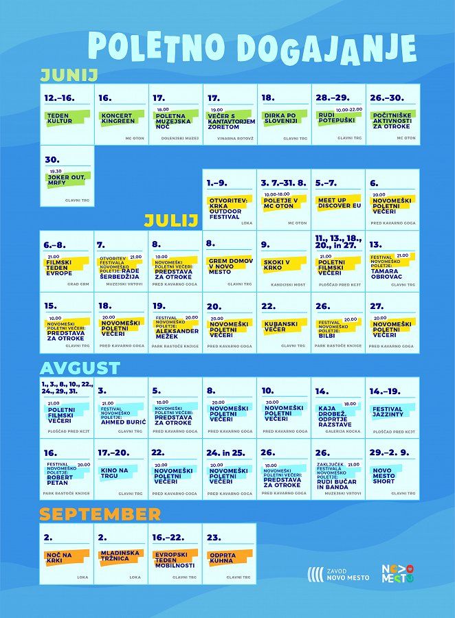 Poletje je čas, ko naše mesto zaživi z različnimi dogodki, festivali in prireditvami, ki pritegnejo obiskovalce iz vseh koncev in krajev. To je čas, ki nas spominja na brezskrbnost, sprostitev in veselje do druženja, glasbe, kulinarike, umetnosti, kulture, vsega, kar nas navdušuje in nas druži. V našem mestu pripravljamo pestro paleto dogodkov za vse okuse, od dogodkov za najmlajše do koncertov, filmskih večerov in razstav, ki vam bodo zagotovo oplemenitile poletne mesece.