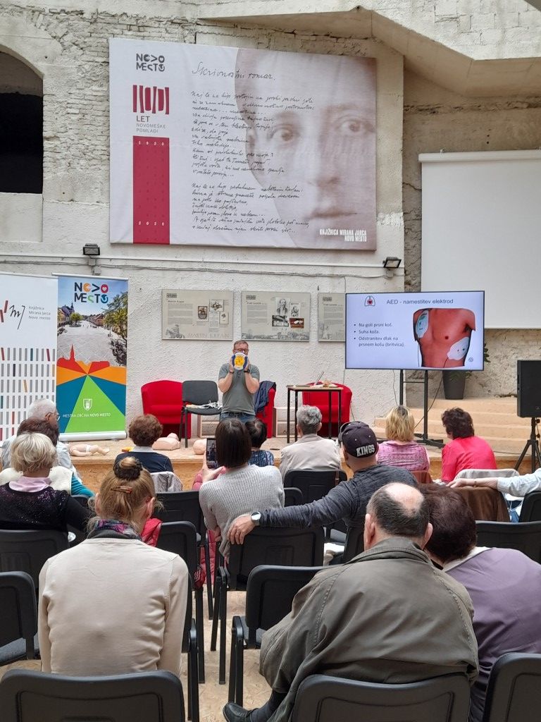 Tokratno srečanje Univerze za starejše RIC Novo mesto je bilo drugačno, saj smo se zbrali v  atriju Knjižnice Mirana Jarca Novo mesto, kamor so povabili vse, ki jih to zanima. Zbrani smo bili iz različnih društev in organizacij. Gospod Andraž Ogorevc je lastnik iHELP d.o.o. in skuša s svojim predavanjem pomagati in poučiti ljudi, da bi znali oživljati in nuditi prvo pomoč. Pri zastoju srca so važne prve minute in prava pomoč ohrani življenje.
