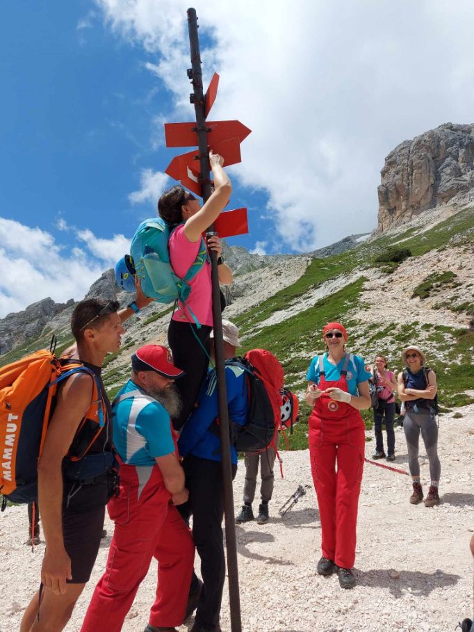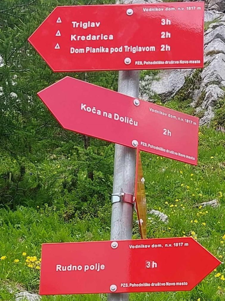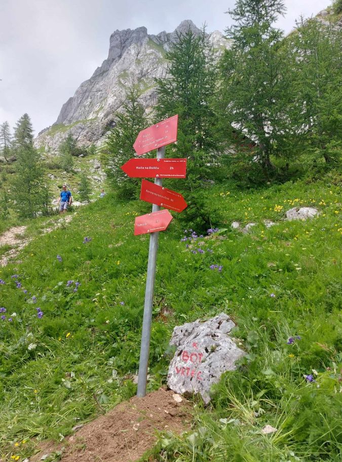 Po vožnji do Pokljuke in triurni hoji do Vodnikovega doma smo začeli urejati pot. Pri domu smo postavili drog in table, ki nas usmerijo na obe naše poti, ki vodijo proti Triglavu oziroma v Pokljuko ali v Krmo.