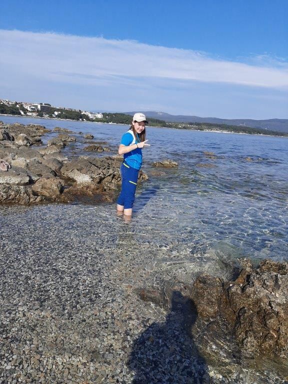 »V nedeljo smo se ob 5.30 z avtobusom odpravili na Hrvaško. Na poti smo imeli 1 pavzo. Ko smo prišli na Krk smo se registrirali za ladjico in kosilo, ter se po skupinah odpravili na pot. Jaz sem bila v skupini B. Pot smo začeli v mestu in jo po vročem soncu in z lepim razgledom nadaljevali. Hodili smo skozi gozd, travnik in nekaj tudi po peščeni cesti, dokler nismo prišli do pavze, kjer so ugotovili, da je del skupine zgrešila pot. Po približno 20. minutah smo pot nadaljevali in se kmalu približali morju. Pri morju smo se ustavili na pijači in sladoledu, da smo počakali ladjico. Ladjica nas je peljala ob obali, kjer smo videli tudi jastrebe in galebe. Ko smo prišli nazaj na zbirno točko smo pojedli kosilo. Po kosilu pa smo do 17.30 imeli prosto. Med prostim časom smo si lahko namakali noge v morju, šli na pijačo ali sladoled, si ogledali mesto… Za konec pa smo se z avtobusom vrnili nazaj v Slovenijo.«