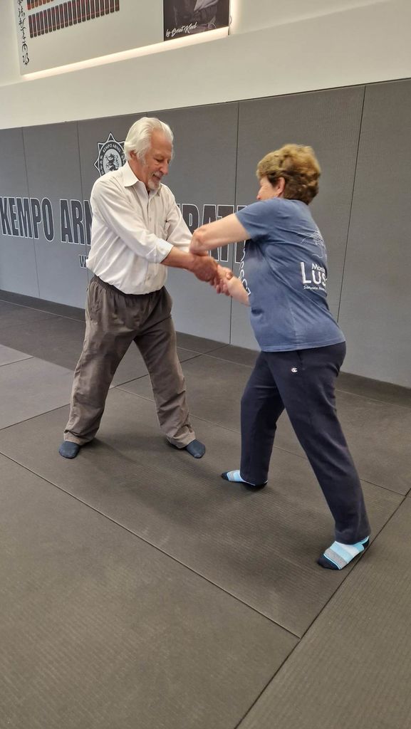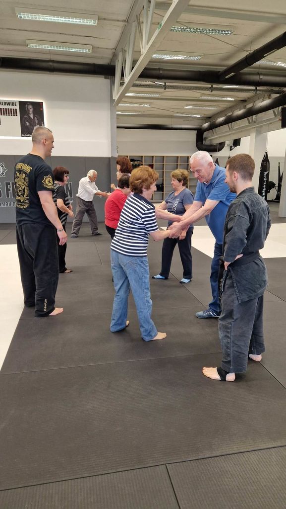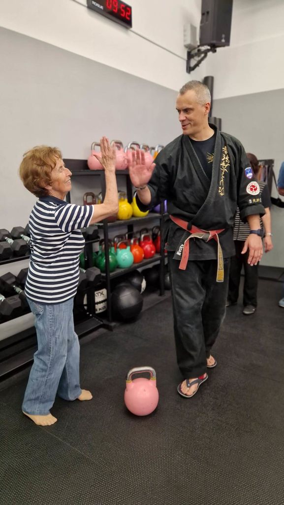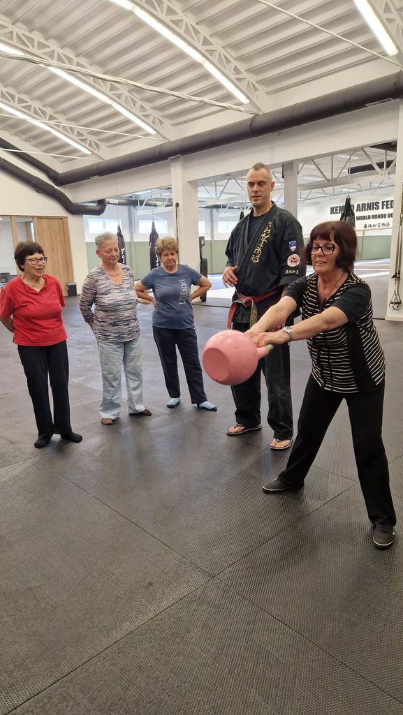 Ta četrtek sta posvetila svoj čas nam - starejšim, da bi z njihovim znanjem znali braniti sebe in svoje imetje. Že sama misel, da znamo nekaj pravih prijemov in odzivov nanje, nas bo opogumila. S sodelavcem Lukom Jantolek sta se potrudila, da smo spoznali naprave, naredili vaje s pripomočki, potem pa še vaje na blazinah. Luka je zanimiv sogovornik in dobro pozna kulturo in obrede Japoncev. Bila sta dobra gostitelja, učitelja in odlična trenerja. To dokazuje njuno pripadnost ideji Kempovcev in pripravljenost, da znanje širita med ljudi.
