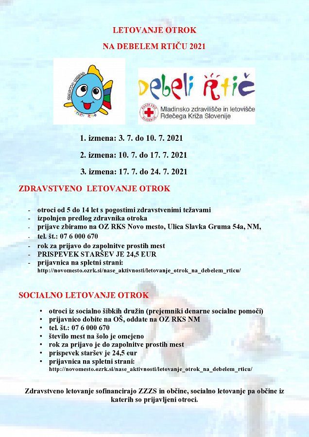 Za zdravstveno letovanje pridobijo starši napotitev za otroke pri svojih zdravnikih oz. pediatrih za tiste otroke, ki so imeli v letu od februarja 2020 do februarja 2021 po dva zapisa o bolezni otroka v zdravstvenem kartonu. Za socialno letovanje sprejemamo prijave na Območnem združenju RKS Novo mesto, zaradi omejenega števila mest bodo izbrani otroci z najnižjimi dohodki na družinskega člana. Prispevek za sedem dnevno letovanje na Debelem rtiču je 24,5 eur. Prijave zbirajo na novomeškem Rdečem križu do zapolnitve mest. Vse informacije se dobijo na spletni strani: Letovanje otrok na Debelem rtiču | OZRK Novo mesto