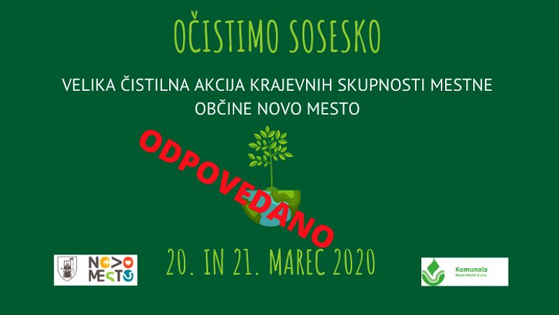 Dopolnjeno 16. 3. 2020: Čistilna akcija Očistimo sosesko, ki je bila v novomeških krajevnih skupnostih načrtovana v petek, 20. marca, in v soboto, 21. marca, je zaradi epidemije koronavirusa odpovedana. Nov datum bo objavljen naknadno! Hvala za razumevanje. Ostanite zdravi in doma.