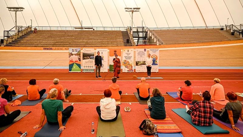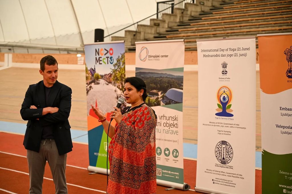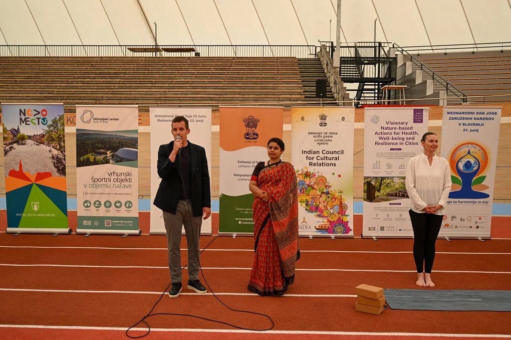 Festival joge in dobrega počutja Surja, ki se po Sloveniji odvija na pobudo Veleposlaništvo Indije, je v torek 11. 6. 2024, občane in občanke privabil v Olimpijski center Novo mesto. Na brezplačni vodeni vadbi joge pod streho velodroma, kamor so se umaknili pred dežnimi kapljami, so ljubitelje sproščujočega in zdravega raztezanja pozdravili veleposlanica Republike Indije Namrata S. Kumar, vodja Olimpijskega centra Novo mesto Ana Seliškar in podžupan Urban Kramar, ki je telovadce povabil tudi k obisku bazena ter nove trime steze v Češči vasi.