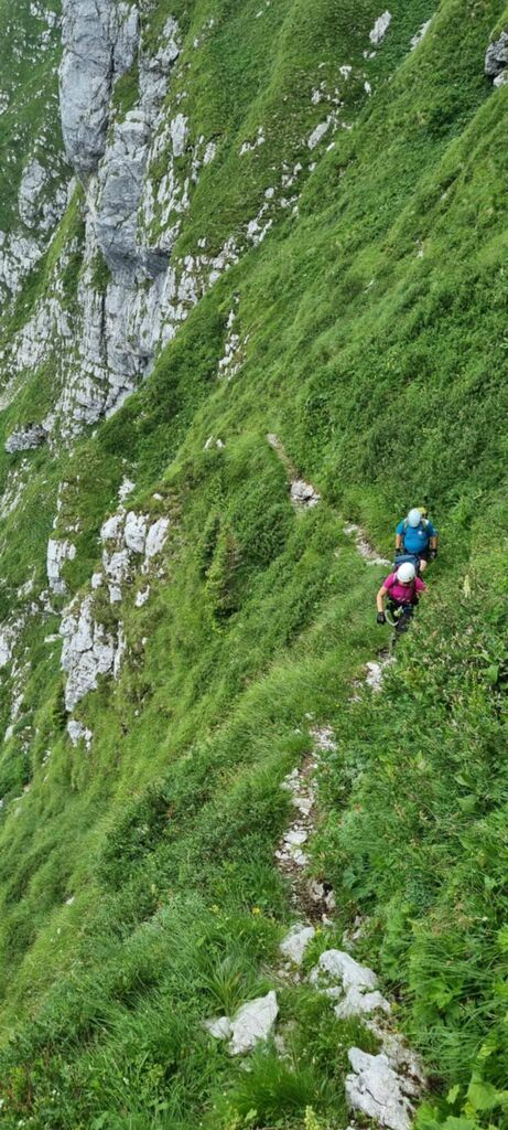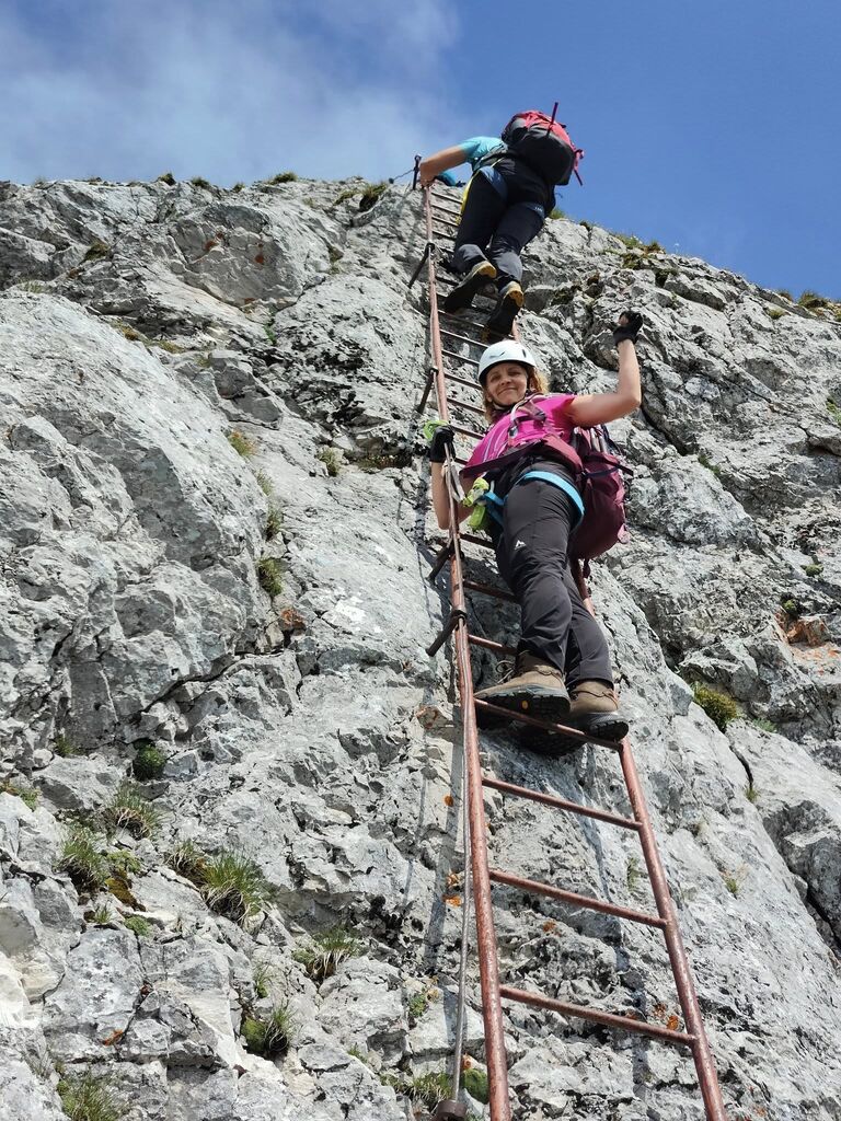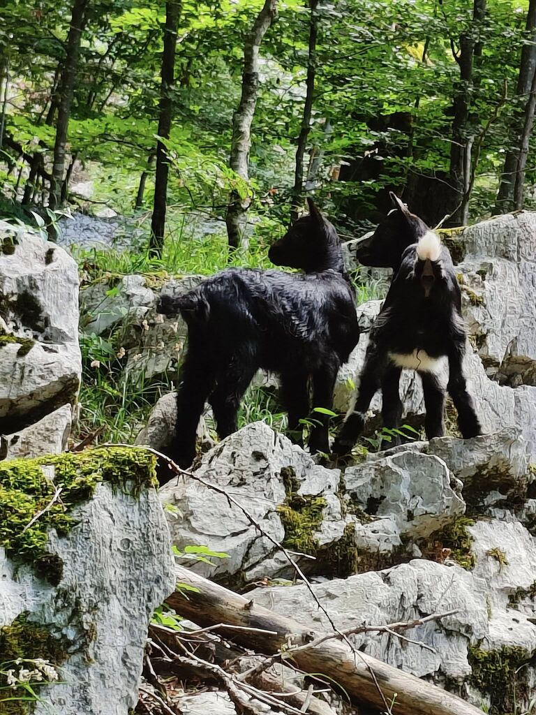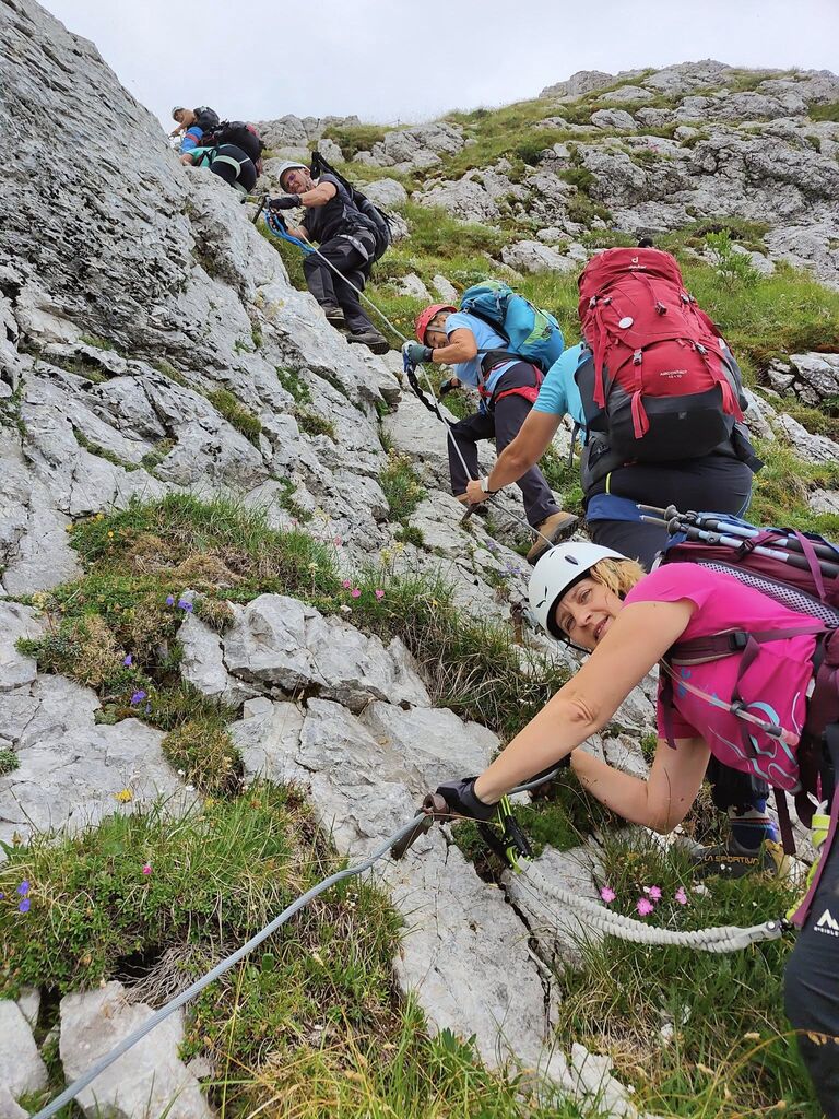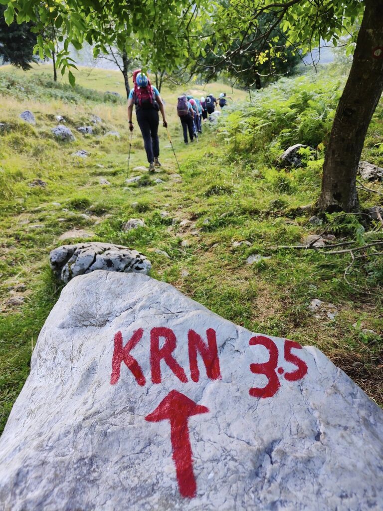 Pot je sprva potekala po gozdu in pašnikih, kjer so nas zvedavo opazovale koze. Po uri in pol hoje, s postankom pri bivaku na Črniku, smo prispeli do začetka plezalnega dela poti, kjer smo si nadeli varovalne pasove in čelado, saj se stena postavi skoraj navpično. Po vzpenjanju s pomočjo jeklenic sledi strmo nezavarovano travnato pobočje, ki je zahtevalo vso našo pozornost in previdnost. Pot se je nadaljevala po izpostavljenem grebenu, v pomoč in popestritev pa sta bili tudi dve lestvi. Še malo jeklenic in že se je pokazalo Gomiščkovo zavetišče. Takoj smo želeli osvojiti še 10 minut oddaljen vrh Krna, z 2.244 metri.