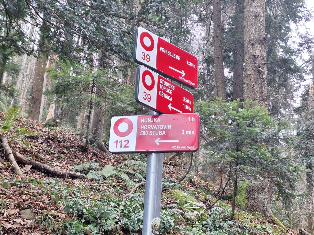 Skozi gozd, ter ob potočku Bistri Jarek, smo se povzpeli do počivališča Srnec. Tu smo zavili proti severu na Horvatove stube, katere je nadelal zagrebški planinec in novinar Vladimir Horvat. Njegov namen je bil približati to povsem neznano območje ostalim ljudem. Pot nas je vodila skozi jamo Medvednica. V nadeljevanju pa smo si lahko ogledali še Malo Pečino, Tisin ponor, Patuljkovo jamo in se ustavili še na dveh razglediščih. Naprej po poti skozi gozdove in travnike mimo Hunjke in tik pod vrhom, kjer prečimo smučišče pridemo na vrh, ki je zaradi dreves delno omejen z razgledi, zato smo se nekateri povzpeli na TV stolp, ki ponuja lepe razglede daleč na okoli.