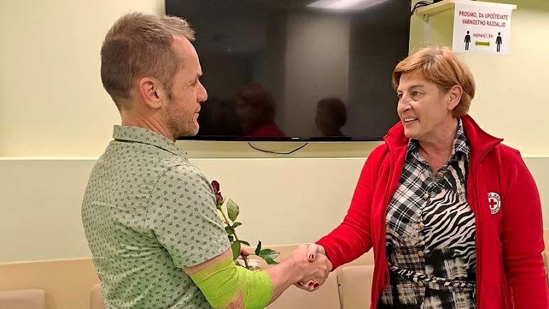 Na Centru za transfuzijsko dejavnost Novo mesto so danes čestitali prvemu letošnjemu jubilantu, Eriku Kraševcu iz KORK Majde Šilc, ki je kri daroval stotič. Z darovanjem je začel leta 1998 pri 25 letih, kri pa daruje, ker je ugotovil, da lahko z malim vložkom močno pomaga ljudem okoli sebe.