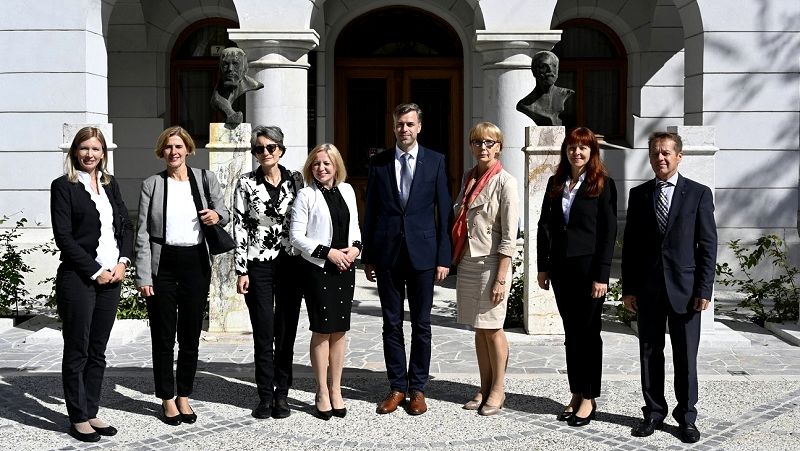 Na fotografiji od leve proti desni: prodekanja doc. dr. Katarina Rojko, dekanja doc. dr. Nevenka Kregar Velikonja, prorektorica prof. dr. Karmen Erjavec, dekanja doc. dr. Lea-Marija Colarič-Jakše, župan mag. Gregor Macedoni, direktorica občinske uprave dr. Vida Čadonič Špelič, dekanja mag. Iris Fink Grubačević, dekan prof. dr. Boris Bukovec.