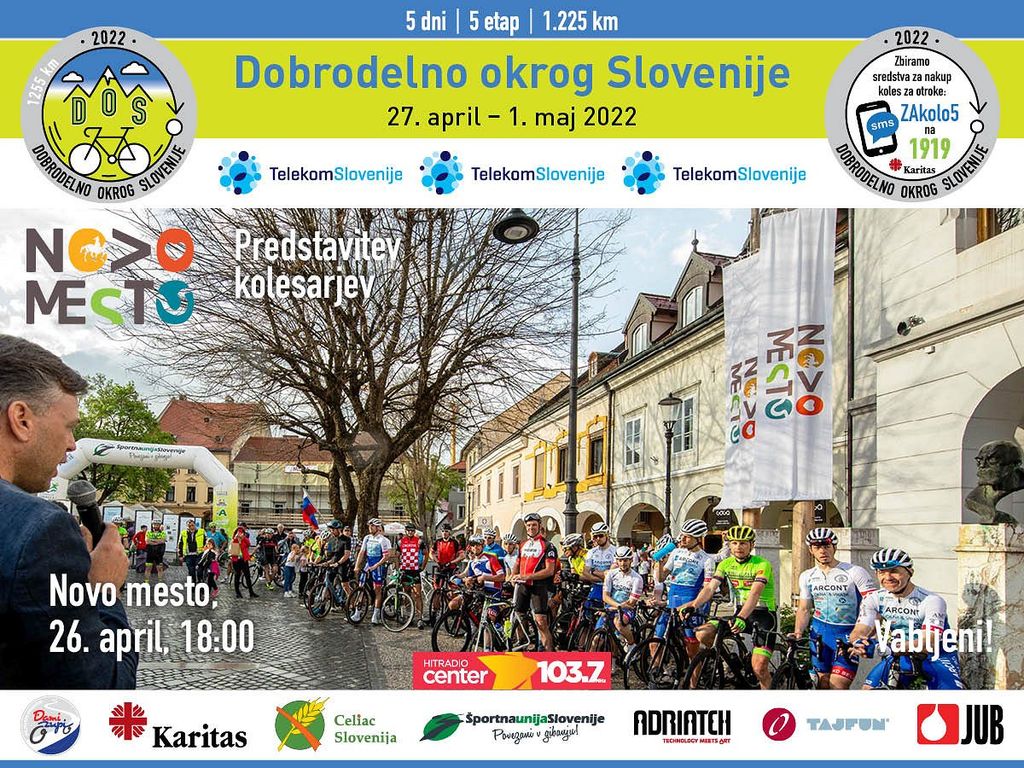 Na dobrodelnem vseslovenskem kolesarskem dogodku Dobrodelno okrog Slovenije – DOS, ki se bo odvijal med 27. aprilom in 1. majem 2022, bo 25 kolesarjev v petih etapah obkrožilo Slovenijo na 1225 kilometrov dolgi trasi. Vožnjo bodo začeli in sklenili na novomeškem Glavnem trgu, kolesarili pa bodo za nakup koles za otroke iz socialno ogroženih družin.
