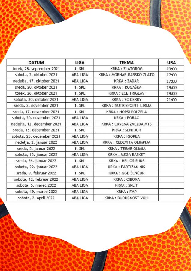 Košarkarski klub Krka-Telekom Novo mesto je prejel datume tekem, ki jih bodo odigrali v aktualnih sezonah državnega prvenstva in ABA lige, naslednja tekma jih čaka že jutri, 28. septembra 2021, ob 19. uri. Spopadli se bodo z Zlatorogom.