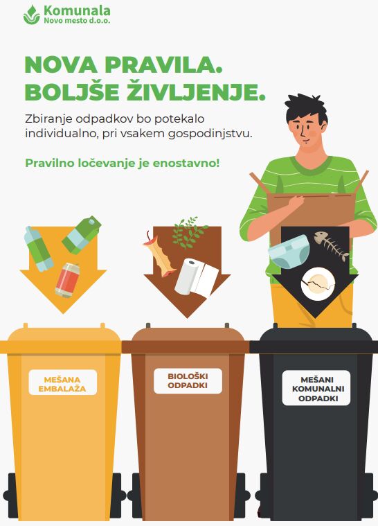 Čisto in urejeno okolje ni samoumevno—ustvarjamo ga vsi mi, vsak dan, z majhnimi, a pomembnimi odločitvami. Ena takih je pravilno ločevanje odpadkov, skrb za biološke odpadke in spoštovanje predpisov, s katerimi lahko vsak od nas prispeva k bolj zdravemu in prijetnemu okolju. Predpisi s področja ravnanja s komunalnimi odpadki določajo, da je treba posamezne vrste komunalnih odpadkov odlagati v za to namenjene zabojnike za ločeno zbiranje odpadkov na prevzemnih mestih ali v zabojnike pri posameznih uporabnikih.