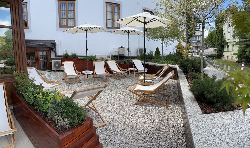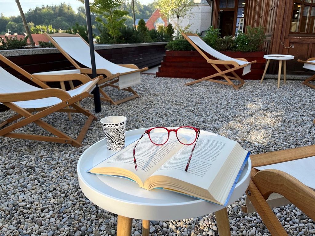 Na terasi knjižnice so uredili čisto pravo kamnito plažo z ležalniki, senčniki ter mizicami in stoli, ne manjka pa niti bazenček, kjer se lahko ohladijo in zabavajo najmlajši obiskovalci. Za prijetnejše počutje so zasaditvi dreves in grmičevja na terasi dodali visoko gredo, od koder se širijo arome zdravilnih zelišč in dišavnic. Tu se lahko ob prebiranju časopisov, revij ali knjig odpočijete in si zbistrite misli. Če vam ni do branja, lahko le počivate in uživate ali pa poklepetate v dobri družbi. Na plaži najdete tudi Igrobežnico, namenjeno izmenjavi rabljenih iger in igrač po sistemu »prinesi, česar ne potrebuješ in vzemi, kar ti je všeč«.
