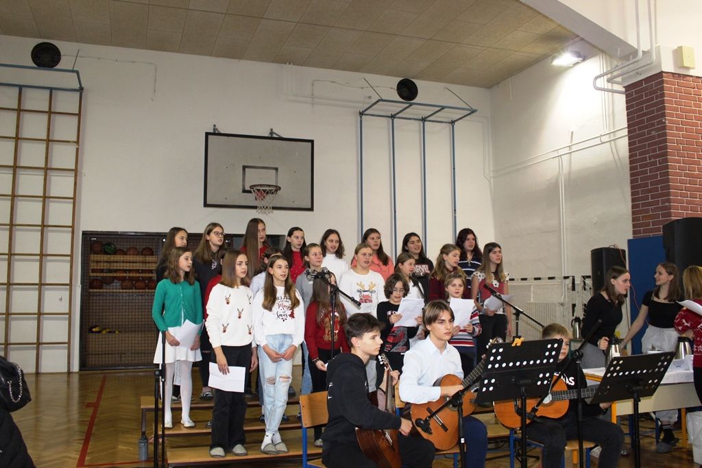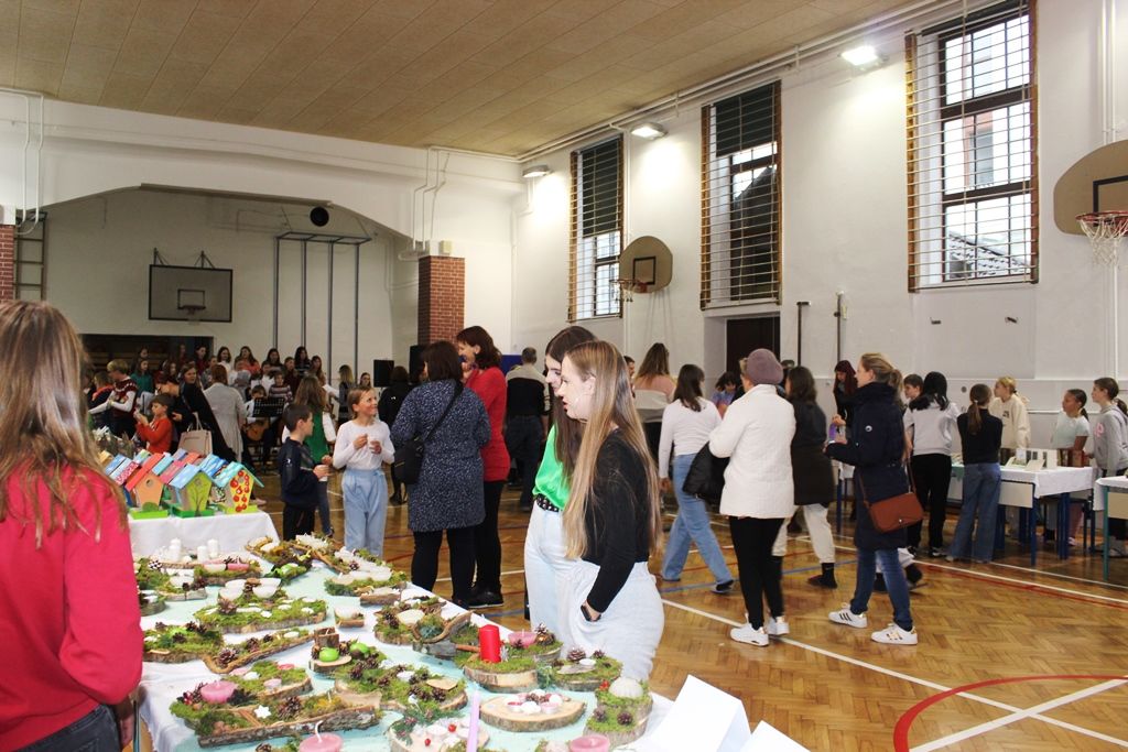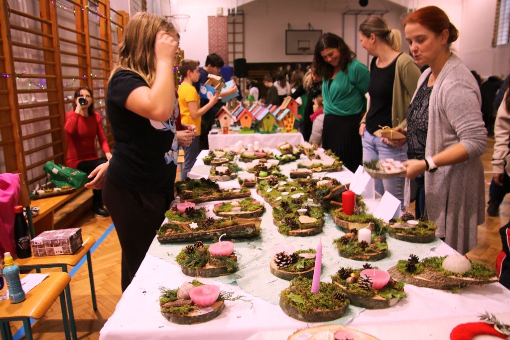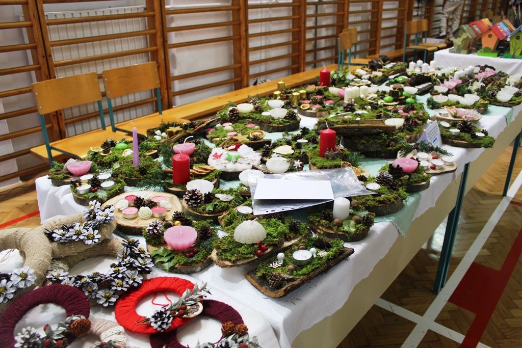 Ponudili smo voščilnice, svečke, darilne vrečke, adventne venčke, obeske, nakit, ptičje hišice in novoletne okraske, navdušili pa so nas tudi domači piškoti, sadni smutiji in vroča čokolada. Izdelke smo ustvarjali z različnimi tehnikami iz večinoma naravnih materialov, kot so les, glina, volna, čebelji vosek, veje, storži, karton ali odpadni papir. Postavili in okrasili smo novoletno smreko z lučkami, praznično vzdušje pa so pričarali tudi glasbeniki in pevci pevskega zbora OŠ Center.