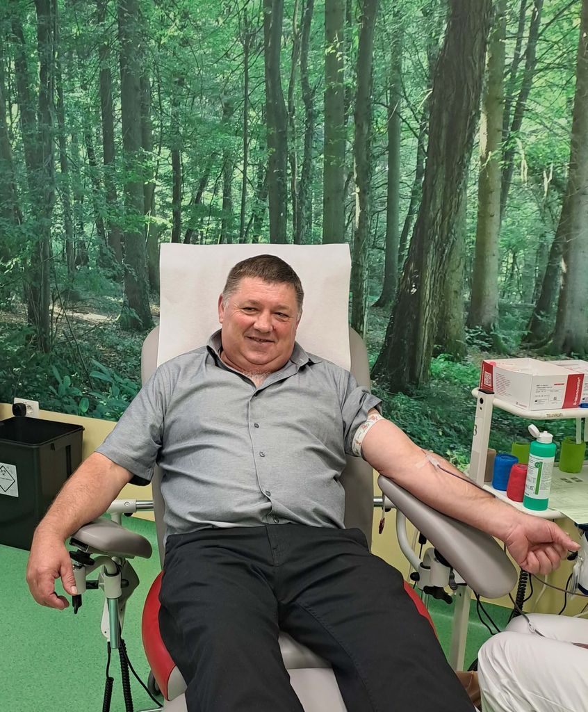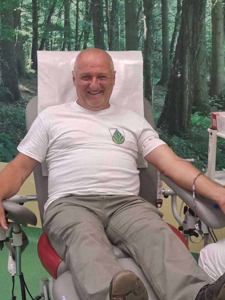 Ob 10. uri pa smo pričakali krvodajalca Duškota Gorenca iz KORK Dolenjske Toplice, ki je daroval kri stopetdesetič. O njem je bilo pravzaprav že veliko povedanega, saj to ni njegov prvi jubilej, saj je krvodajalec že od leta 1977, čestitk pa se je do danes nabralo kar nekaj, saj Duško ni samo krvodajalec, temveč se mu po krvi pretaka prostovoljstvo, kot je povedala predsednica OZ RKS Novo mesto Danica Novak Malnar. Je tudi aktiven član topliške krajevne organizacije RK, član nadzornega odbora OZ RKS Novo mesto, član civilne zaščite, gasilec, doma in v tujini pa ga poznajo tudi kot uspešnega jadralnega padalca in predsednika Kluba za prosto letenje Kanja. Danes je kri daroval v sklopu krvodajalske akcije za občane Dolenjskih Toplic, zato so na odvzem prišli tudi njegovi sokrajani in župan Franc Vovk. Ob visokem jubileju so mu čestitali predsednica OZ RKS Novo mesto, župan Franc Vovk, predsednica KORK Dolenjske Toplice Ivana Pelko (Duškova sestra) ter vodja Centra za transfuzijsko dejavnost Mojca Šimc, dr. med.