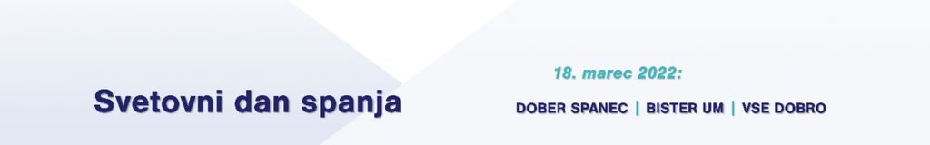 V petek, 18. marca 2022, obeležujemo že 15. svetovni dan spanja, tokrat s sloganom "Dober spanec, bister um, vse dobro". Svetovni dan spanja je mednarodno priznan dogodek, ki poteka pod okriljem Svetovne zveze za spanje (WSS) in je namenjen ozaveščanju javnosti o pomembnosti spanja in njegovega vpliva na naše zdravje ter preprečevanju in obvladovanju motenj spanja . V preteklosti je obeleževanje potekalo v okviru Slovenske skupine za spanje, ki deluje v sklopu ESRS-Evropske zveze za raziskave spanja. V zadnjih dveh letih pa ga obeležujemo širše, v sodelovanju različnih inštitucij. S skupnim prizadevanjem je pozornost javnosti in vsebina spanja v slovenskem prostoru naslovljena širše.