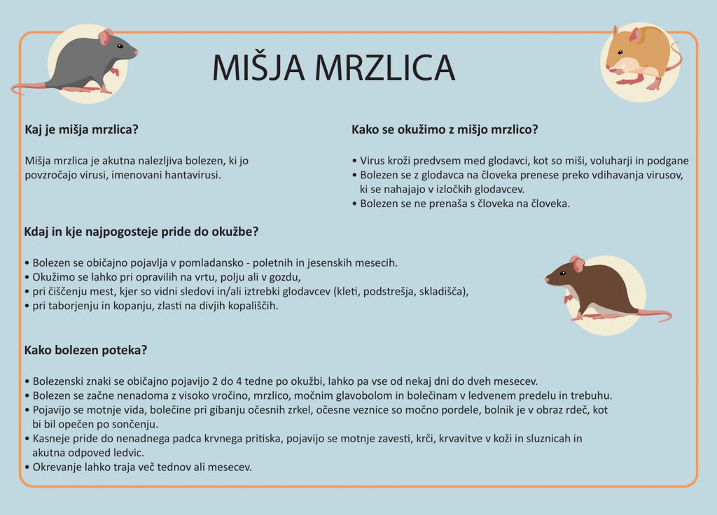 Na Nacionalnem inštitutu za javno zdravje so letos v Sloveniji zaznali porast primerov mišje mrzlice, kar se odraža tudi v večjem številu hospitalizacij in obravnav bolnikov. Hemoragična mrzlica z renalnim sindromom oziroma mišja mrzlica je akutna nalezljiva bolezen, ki jo povzročajo hantavirusi. Bolezen se z glodavca na človeka prenese z vdihavanjem virusov, ki so v izločkih glodavcev, bolezen pa se ne prenaša s človeka na človeka.