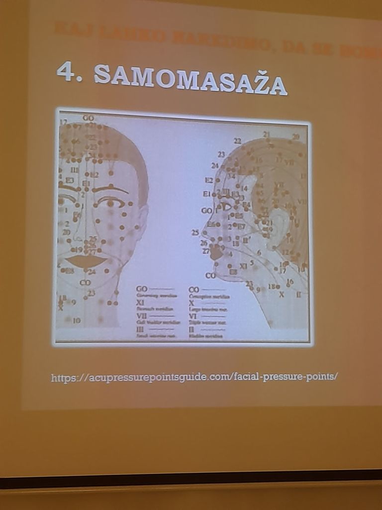 Začeli smo z meditacijo. Nato nas je izzvala z vprašanjem Kaj lahko sami naredimo v tem času? Najvažnejši je dotik, ki je osnovna potreba človeka od rojstva do smrti. Naša koža obsega 1,7 kvadratnih metrov in je oživčena, zato je dotik ljudem prirojen, saj sprošča hormone sreče, zato so dotiku nujni. Že dojenčki pogrešajo dotike in nežnost in drugače delujejo, če tega ne doživljajo. Tudi starejši in mladi smo zaradi dotikov srečnejši. Z objemi ljudi ali dreves večamo svoje dobro počutje in oboji so zdravilni za človeka. Z božanjem se sproščamo in po objemih je naše razpoloženje boljše. Torej, imamo roke in te so orodje, da sebe osrečujemo in zdravimo. Vse je v naših rokah. Vendar so važne tudi naše misli, s katerimi lahko podiramo in gradimo. Z dobrimi mislimi ustvarjamo zdravo okolje in širimo krog pozitivnega. Zato je važno, kaj in kako razmišljamo. Mislite torej pozitivno! Prvi stik s svetom je naš obraz. Na obrazu je 52 mišic in točk - pretočnih kanalov, ki jim s pritiskom na točke sprostimo pretok energije po celem telesu. Spoznali smo samomasažo obraza, ki jo je pokazala predavateljica. Dobili pa bomo navodila, da bomo doma sami s čistimi rokami božali in gladili svoj obraz. Imejte se radi, božajte sebe in druge, objemajte bližnje in drevesa in se dotikajte vsega, kar vam ugaja! Orodje imate v rokah, zato ne odlašajte! Poskrbite, da bodo hormoni izzvani in vas sproščali in osrečevali!
