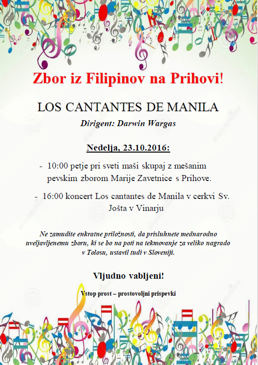 Nedelja, 23.10.2016: ob 10:00 sodelovanje zbora pri sveti maši, ob 16:00 koncert Los Cantantes de Manila v cerkvi Sv. Jošta v Vinarju.