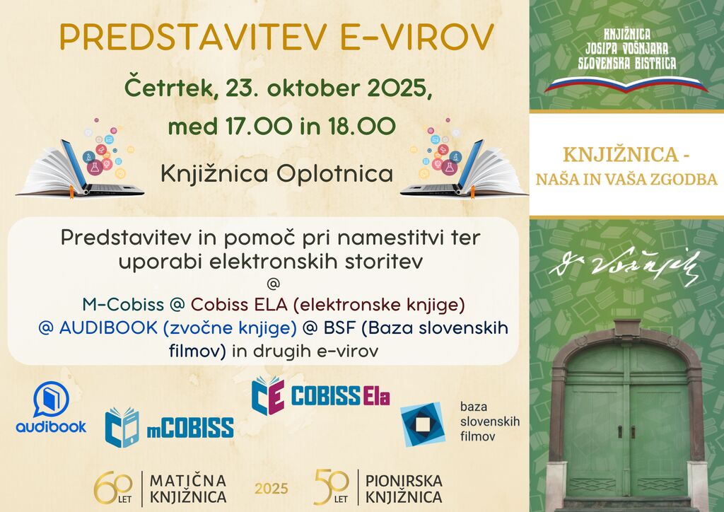 Knjižnica Oplotnica vas vabi na predstavitev e-virov, kjer vam bomo predstavili in pomagali pri namestitvi ter uporabi elektronskih storitev, M-Cobiss, Cobiss Ela, Audibook, Baza slovenskih filmov, ...