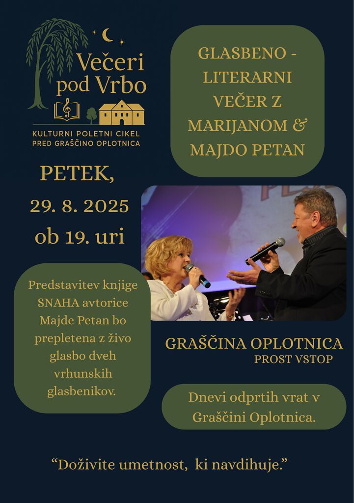 V sklopu kulturnega poletnega cikla Večeri pod Vrbo vas vabimo na edinstven večer, kjer se bosta prepletla moč besede in glasbe. Pisateljica Majda Petan bo predstavila svojo knjigo Snaha, globoko osebno in pretresljivo pripoved, ki razgalja čustva, odnose in notranje boje, a hkrati prinaša svetlobo, razumevanje in mir. Delo je tenkočuten poklon mami ter iskreno razmišljanje o tem, kako živeti, razumeti in odpuščati.
