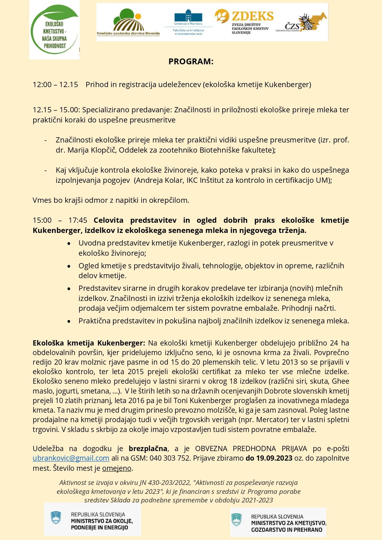 Zveza društev ekoloških kmetov Slovenije (ZDEKS) v okviru "Aktivnosti za pospeševanje razvoja ekološkega kmetovanja v letu 2023" vabi na Ogled dobre prakse: Ekološka živinorejska kmetija Kukenberger ter raznovrstnost predelave in trženja izdelkov iz ekološkega senenega mleka & Specializirano predavanje: Značilnosti ekološke prireje mleka in praktični koraki do uspešne preusmeritve Kdaj: v sredo, 20. september 2023 z začetkom ob 12. uri Kje: na ekološki kmetiji Kukenberger, Gorenje Ponikve 20 8210 Trebnje Udeležba na dogodku je brezplačna, a je OBVEZNA PREDHODNA PRIJAVA po e-pošti ubrankovic@gmail.com ali na GSM: 040 303 752. Prijave zbiramo do 19.09.2023 oz. do zapolnitve mest. Število mest je omejeno.