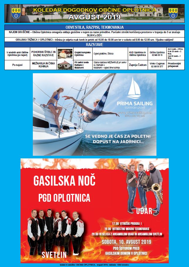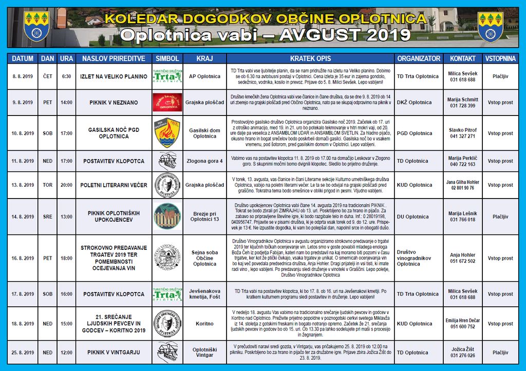 Občina Oplotnica je objavila koledar dogodkov in obvestil za mesec avgust 2019.