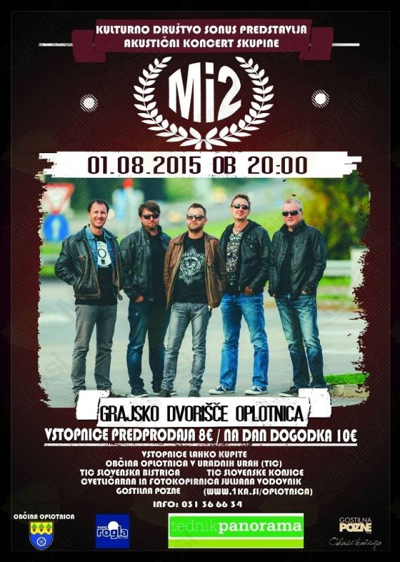 V soboto 1. 8. 2015 ob 20.00 bo v Oplotnici, na GRAJSKEM DVORIŠČU, akustični koncert skupine Mi2, ki ga prireja Kulturno društvo SONUS.