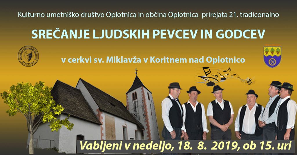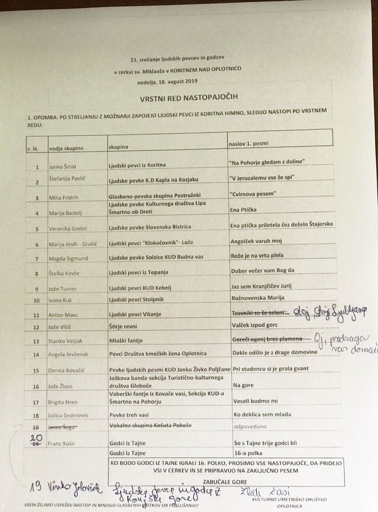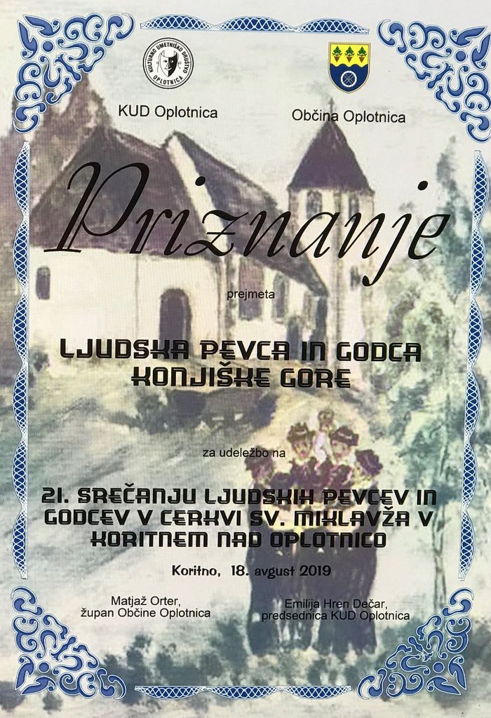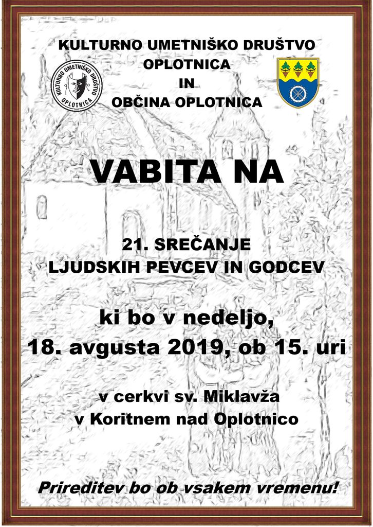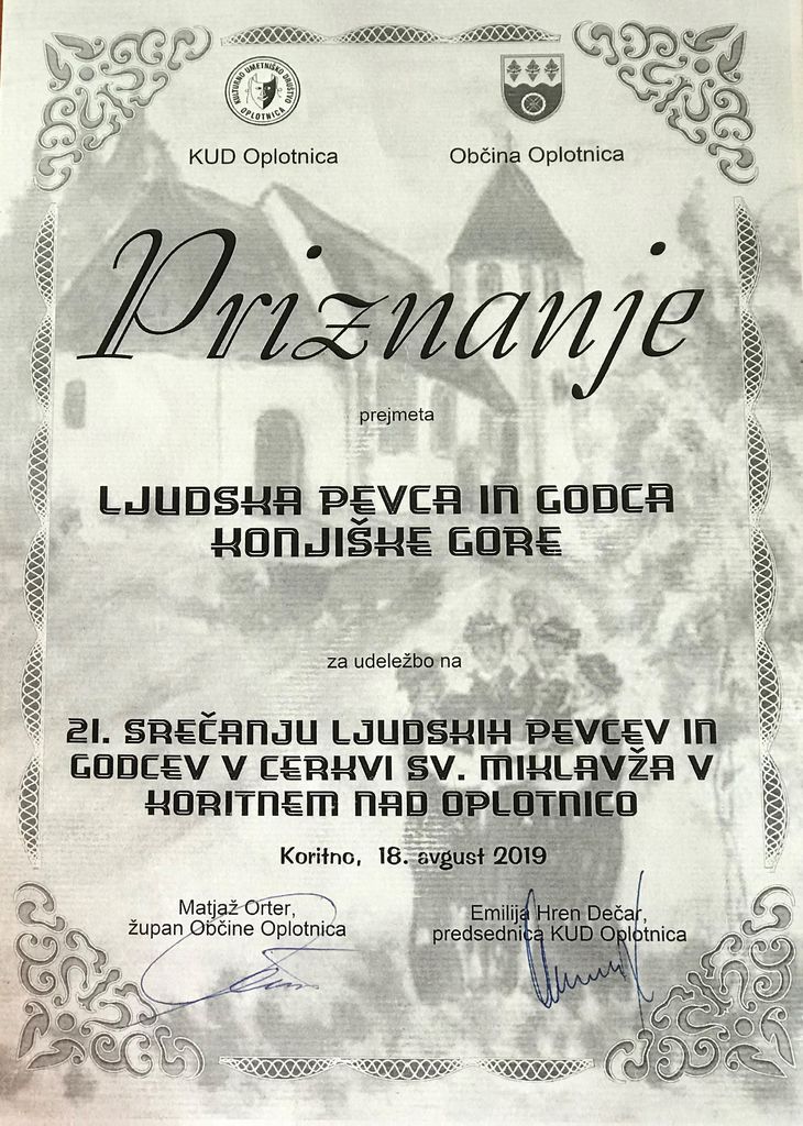 Na delovnem sestanku konec junija smo zasnovali ideje za izvedbo tradicionalne prireditve Koritno 2019. Uspešno smo jih ob podpori Občine Oplotnica izpeljali 18. avgusta 2019 v prelepi poznogotski cerkvici sv. Miklavža v Koritnem nad Oplotnico, in ohranili dolgoletno tradicijo, letošnje srečanje je bilo 21-to. Manjkala je ena skupina, pa bi bilo tudi udeležencev 21. Vse skupine so s svojim izborom pesmi dosegle namen prireditve. Poslušalcem so predstavile dobre stare ljudske pesmi, hvala.