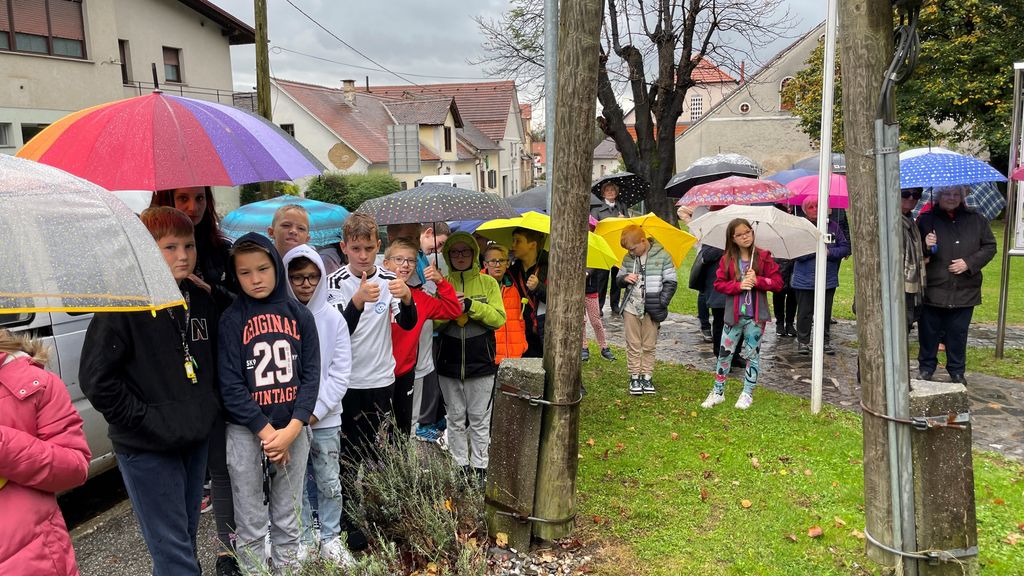 A ni šlo – narava je bila močnejša in je pokazala vso svojo moč. Najprej je začelo deževati, nato je zapihal močan veter in odvzel dotok elektrike. Vsi prisotni smo bili premočeni in izvedbo kulturnega programa smo prekinili. Kljub najboljši želji nam ni uspelo predstaviti vsega, kar smo pripravili v spomin na žrtve 2. svetovne vojne. Prisotni so slišali nastop MePZ DU Oplotnica, deklamacijo Kurir, v izvedbi Bernarde Tič, sledil je govor predsednice OO ZB Oplotnica, še protivojna deklamacija Pismo za Mary Brown in končati smo morali. Učenke in učenci niso imeli priložnosti nastopiti, a kljub temu hvala za njihovo pripravljenost.