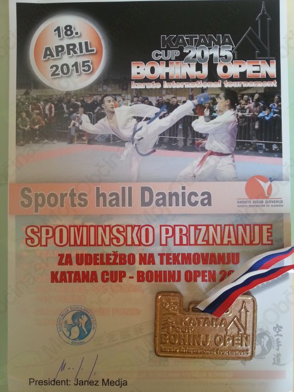 19.4.2015 se je deset članov našega kluba udeležilo mednarodnega turnirja KATANA CUP – BOHINJ OPEN 2015. Turnira, ki je na kolendarju KZS se je udeležilo 350 tekmovalcev iz Slovenije, Avstrije, Srbije, Italije, Nemčije, Slovaške in Hrvaške. Tekmovanje je bilo vodeno s strani svetovnega logističnega centra Sportdata, ki skrbi za vsa največja tekmovanja v okrilju WKF, dogodek pa je bil prenašan direktno na youtube kanal sportdata, kjer si je mogoče ogledati arhivske posnetke. Naši tekmovalci so tokrat tekmovali v katah v svojih in aboslutnih kategorijah, tekmovanja v športnih borbah pa se je udeležil le Jaša Hmelak, ki je osvojil drugo mesto. Najmlajši (Vid Gorenšek - 1. in 3.  mesto, Anže Lampreht - 3. mesto, Benjamin Jelenko - 3. mesto in Tibor Hmelak - dvakrat 2. mesto) so osvajali medalje v vseh svojih kategorijah za konec, pa osvojili tudi prvo mesto v ekipni kati. S tem so dokazali, da ima klub podmladek, katerega ob pridnem treniranju, čaka še svetla prihodnost. Odrezali so se tudi nekoliko starejši Tilen je osvojil tretje mesto, Andraž drugo in tretje v svoji in absolutni kategoriji, Nia pa ostaja na domačih tleh nepremagljiva in je v svoji in absolutni kategoriji ponovno deklasirala sotekmovalke. Tekmovanja se je udeležil še Miha Valenčak, ki mu je ponagajal žreb in Adrijan Stegne, ki sta sicer ostala brez medalje vendar obogatena z novimi izkušnjam.