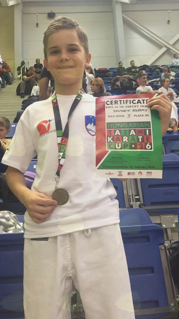 V Budimpešti je 24. 2. 2018 potekal 26. Mednarodni karate turnir "TATAMI CUP 2018", ki se ga je v okviru priprav za Balkansko otroško prvenstvo (Beograd v mesecu aprilu) udeležila 41 članska otroška karate reprezentanca Slovenije. Kot člana širšega izbora, sta se kontrolne tekme v športnih borbah udeležila Benjamin Jelenko in Tibor Hmelak. Turnirja, ki ga je je vodstvo otroške slovenske reprezentance izbralo zaradi močne konkurence predvsem v mlajših kategorijah, so se udeležili tekmovalci iz 11 držav, ki so skupno opravili 850 nastopov Oba naša člana je v Budimpešti spremljal tudi klubski trener Jernej Blatnik. Benjamin Jelenko se je ob zaključku veselil odličnega tretjega mesta, Tibor Hmelak pa je zabeležil eno zmago ter repasažni poraz s sodniško odločitvijo.