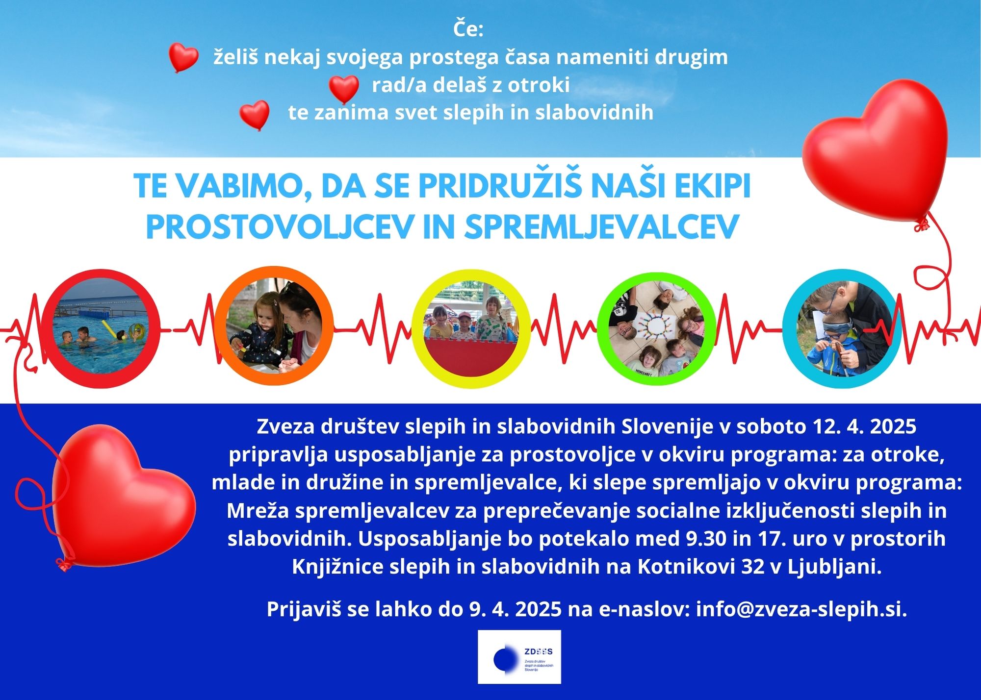 Vas vabimo na usposabljanje, ki bo potekalo: 12.4.2025 med 9.30 in 17. uro v prostorih Knjižnice slepih in slabovidnih Minke Skaberne, Kotnikova 32 v Ljubljani. Prijave so mogoče do srede 9.4.2025 na e-naslovu: info@zveza-slepih.si. Za več informacij lahko pokličete tudi na številko: 01 4700 259.