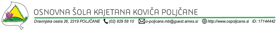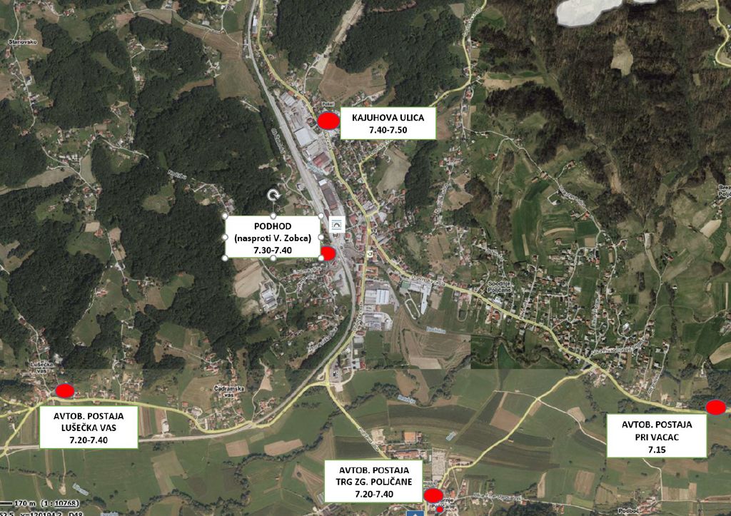 Čas in postaje, kjer bodo učence zjutraj čakali zaposleni v šoli. Zemljevid je v pripomki. Šolskega prevoza iz Lušečke vasi in Zg. Poljčan zjutraj ne bo.