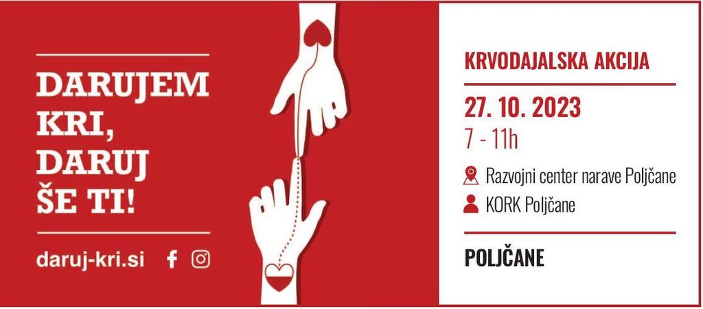 KORK Poljčane organizira KRVODAJALSKO AKCIJO, ki bo v petek, 27. 10. 2023 med 7. in 11. uro v prostorih Razvojnega centra narave v Poljčanah.